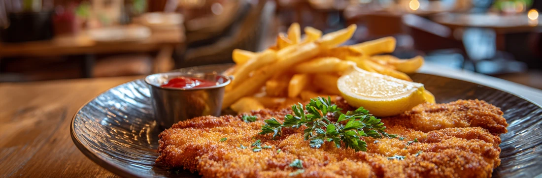 Die Schweineschnitzel werden bei uns frisch aus dem Lachs geschnitten und mit Butterschmalz in der Pfanne gebraten. Sie können wahlweise mit Pommes, Kroketten, Salzkartoffeln oder Bratkartoffeln serviert werden. Dazu reichen wir einen kleinen Salat.